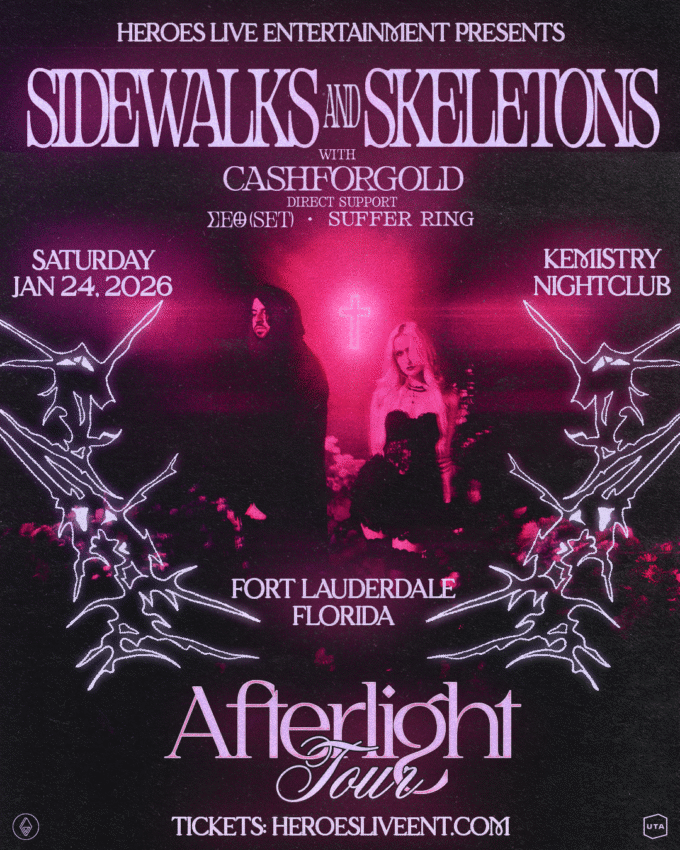 Kemistry Nightclub 307 SW 2nd St, Fort Lauderdale, FL, United StatesHeroes Live Entertainment presents Sidewalks and Skeletons + CASHFORGOLD "Afterlight Tour" with special guests ΣΕΘ(SET) and SUFFER RING on Saturday, January 24, 2026 @ Kemistry Nightclub in Fort Lauderdale. This is the UK artist's debut Florida show. Tickets: https://sidewalksandskeletons.eventbrite.com 7:00PM.....