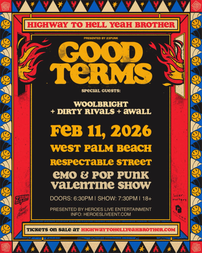 23punk + Heroes Live Entertainment present Good Terms "Emo & Pop Punk Valentine Show" with special guests Woolbright, Dirty Rivals, and AWALL on Wednesday, February 11, 2026 @ Respectable Street in West Palm Beach, Florida. This is the debut Florida.....